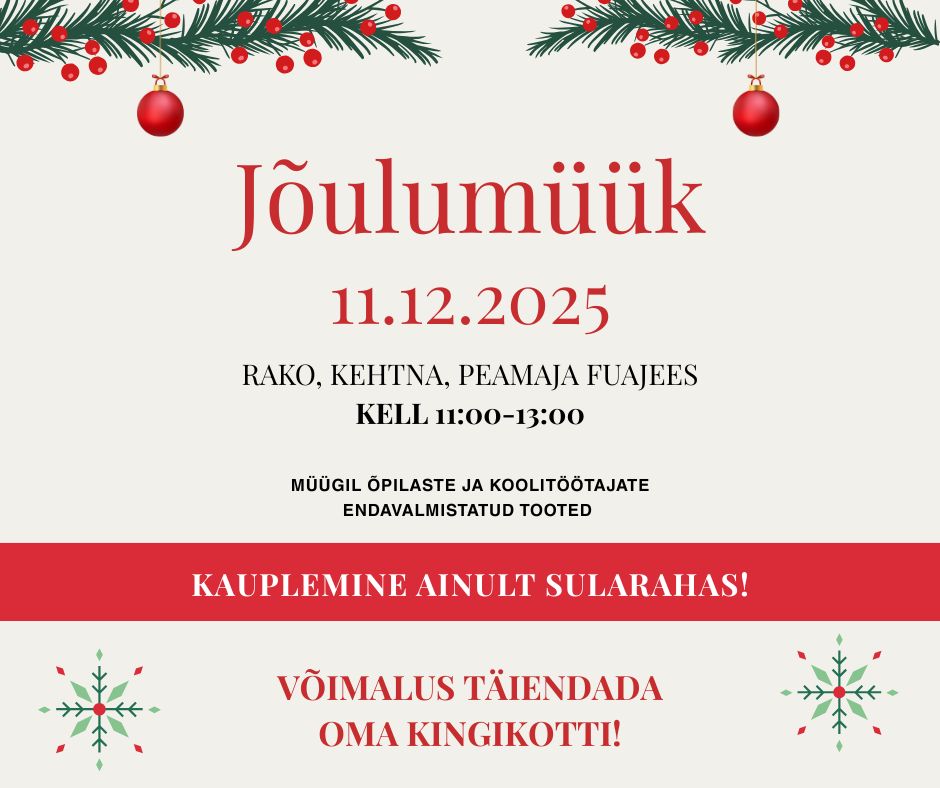 Sel neljapäeval, 11. detsembril toimub Raplamaa Rakenduslikus Kolledžis Kehtna õppekohas mõnus jõulumüük-laadapäev, kus on müügil meie oma õpilaste ja õpetajate valmistatud tooted. Kauplemine käib peamaja fuajees. Tule ka Sina, sest nii saad oma kingikotti vahvate leidudega täiendada!