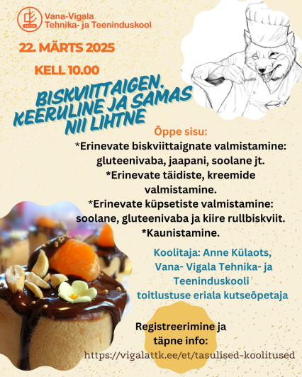 - Erinevate biskviittaignate valmistamine: gluteenivaba, jaapani, soolane jt.