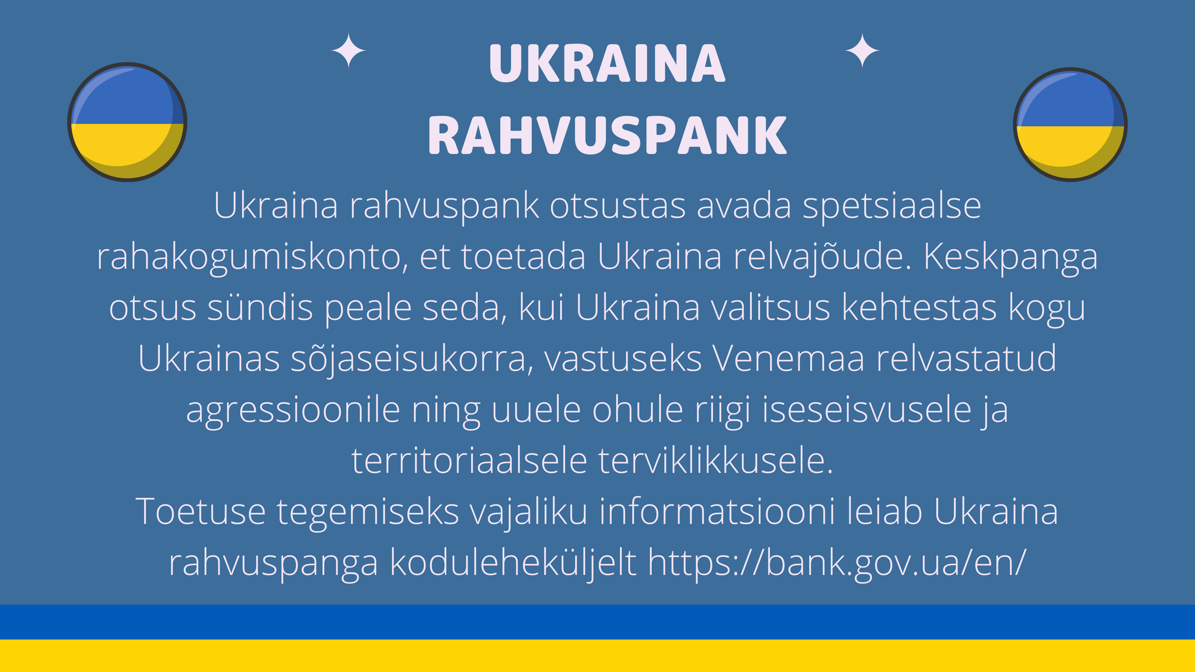 Seoses hetkel Ukrainas toimuva kriisiga on 01.-04.03.2022 võimalik tuua Vana-Vigala Tehnika- ja Teeninduskooli direktori kabinetti annetusi aitamaks Ukraina abivajajaid.