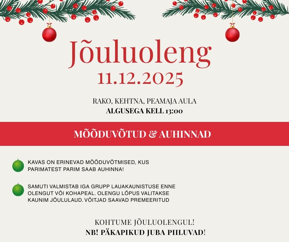 Sama päeva pärastlõunal toimub aulas jõuluoleng kooli õpilastele ja töötajatele, kus ootavad ees lõbusad mõõduvõtud, jõulumeeleolu ja sõbralik võistlusmoment. Parimad saavad loomulikult ka premeeritud!